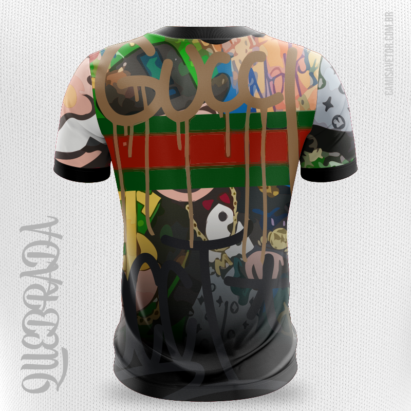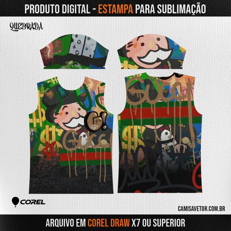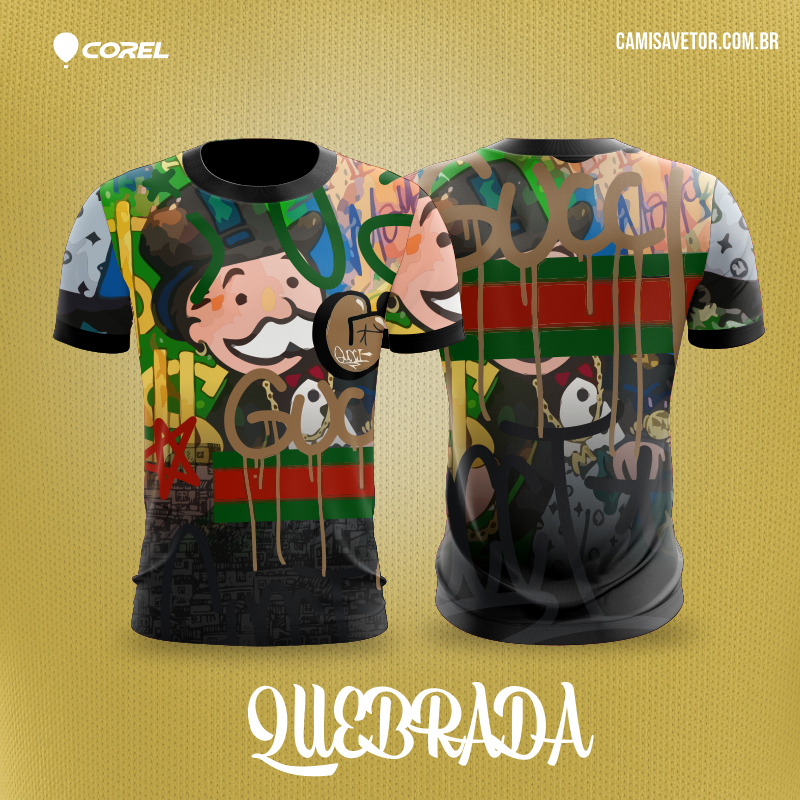 Com nossa estampa vetorizada de Quebrada Gucci em CorelDRAW, você terá a liberdade de criar camisetas personalizadas incríveis e cheias de estilo. Ideal para quem busca designs autênticos e de alta qualidade para sublimação.