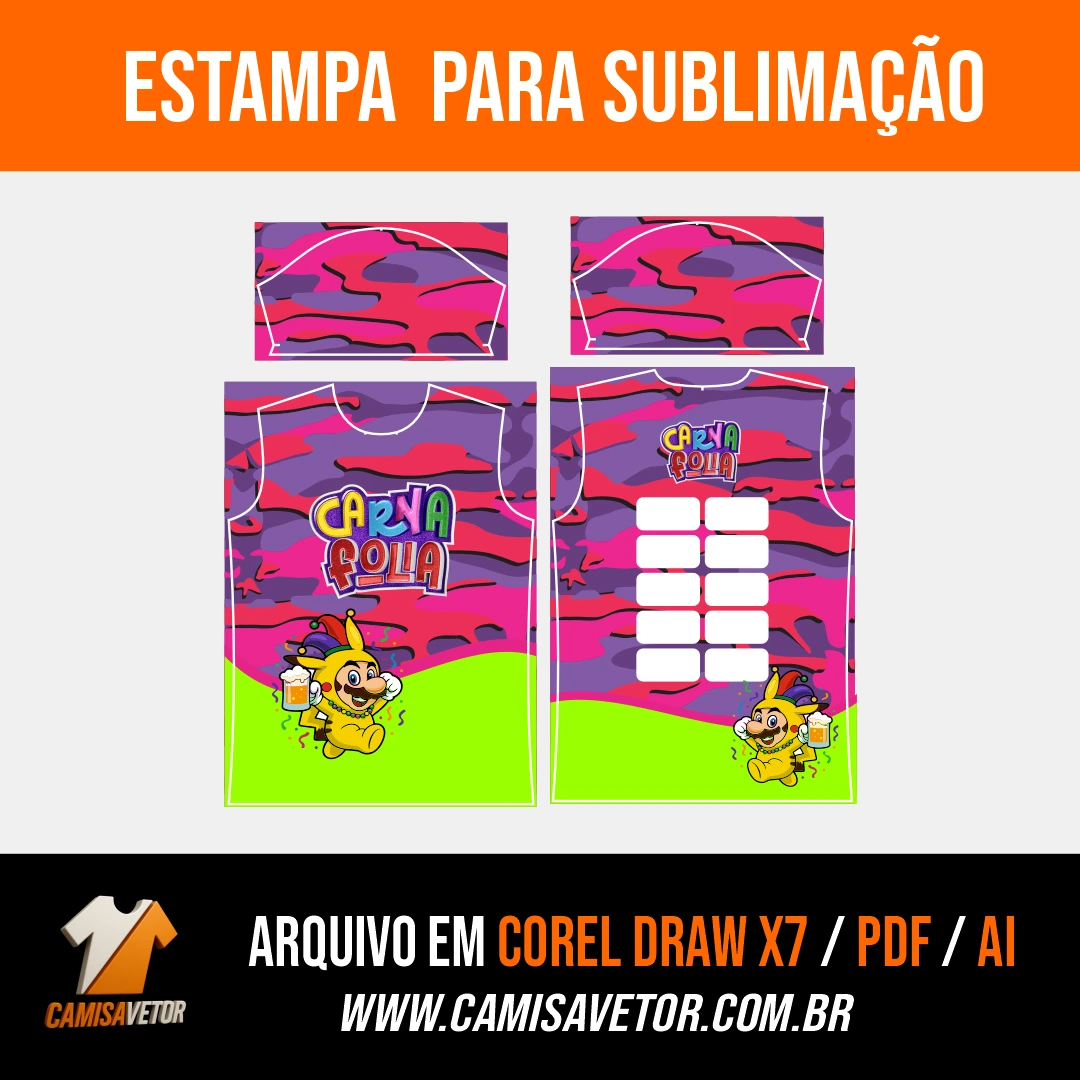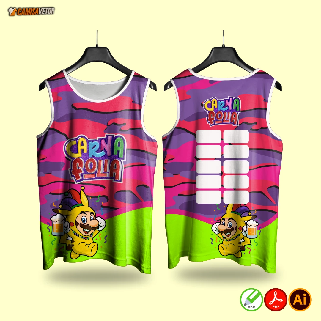 Leve o espírito do carnaval para sua festa ou bloco com a Estampa Abadá CarnaFolia 19! Uma arte vibrante, cheia de cor e energia, perfeita para personalizar abadás, camisetas e uniformes de eventos carnavalescos.