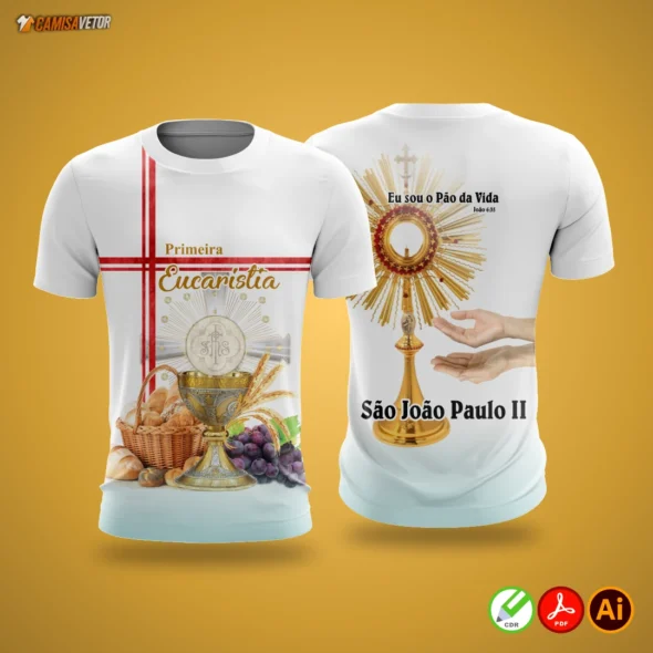 Celebre um dos momentos mais importantes da vida cristã com uma estampa especial e cheia de fé! A Estampa Primeira Eucaristia foi desenvolvida com carinho para eternizar esse sacramento tão significativo. Ideal para camisetas de turmas, eventos religiosos, lembranças e celebrações na igreja.