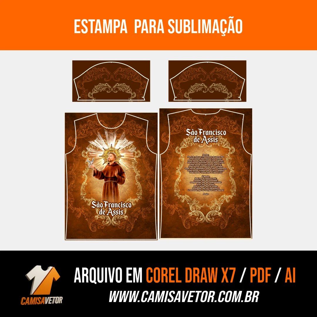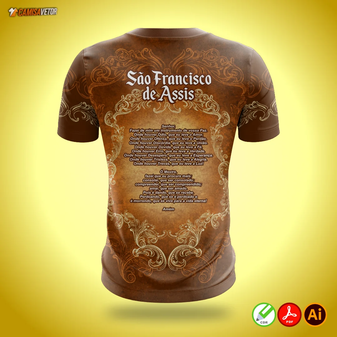Expresse sua fé e amor pela natureza com a Estampa São Francisco de Assis, o santo protetor dos animais e símbolo da humildade e paz. Uma arte inspiradora, perfeita para camisetas de eventos religiosos, grupos de oração, feiras franciscanas, festividades paroquiais ou uso devocional.
